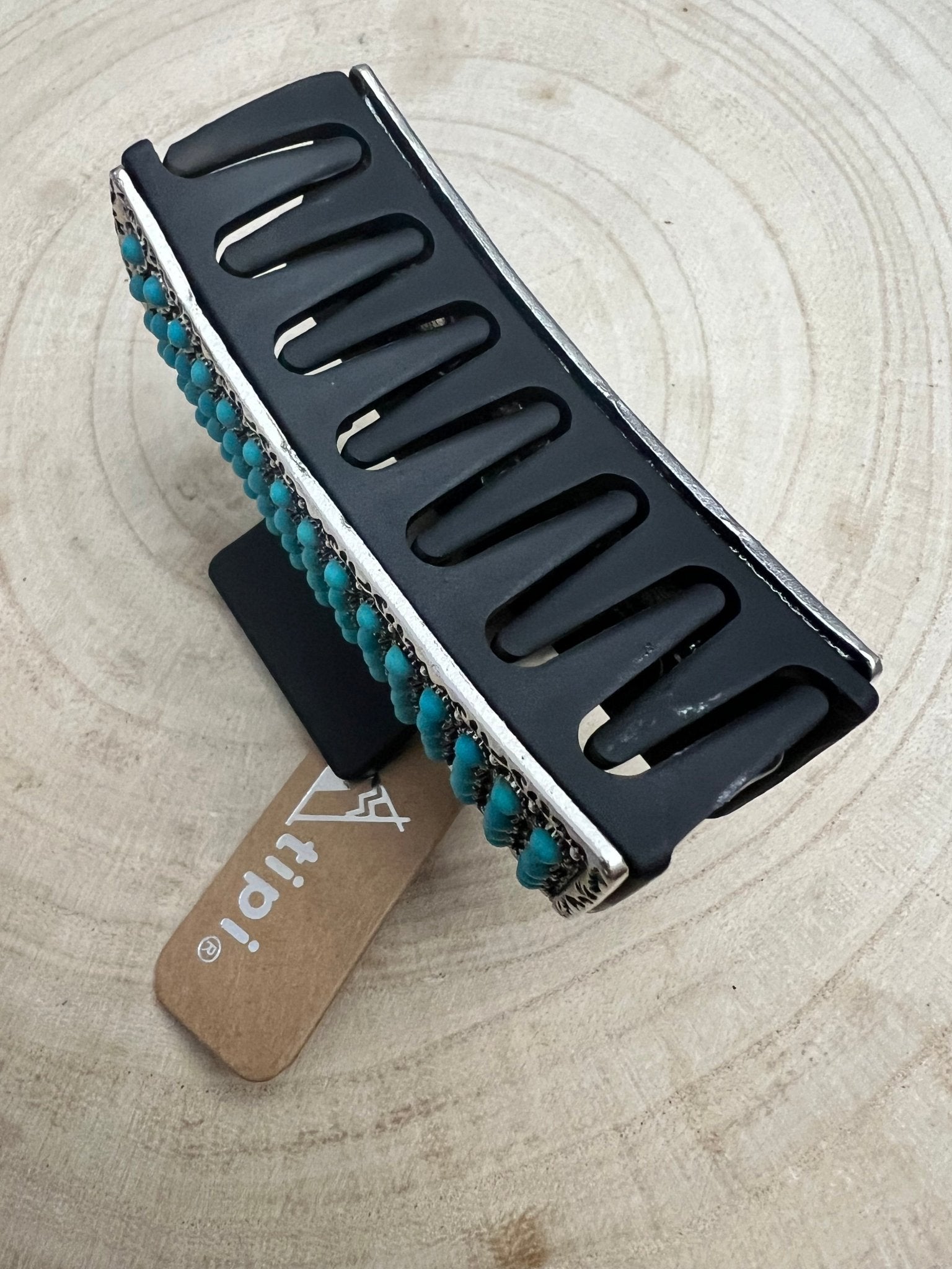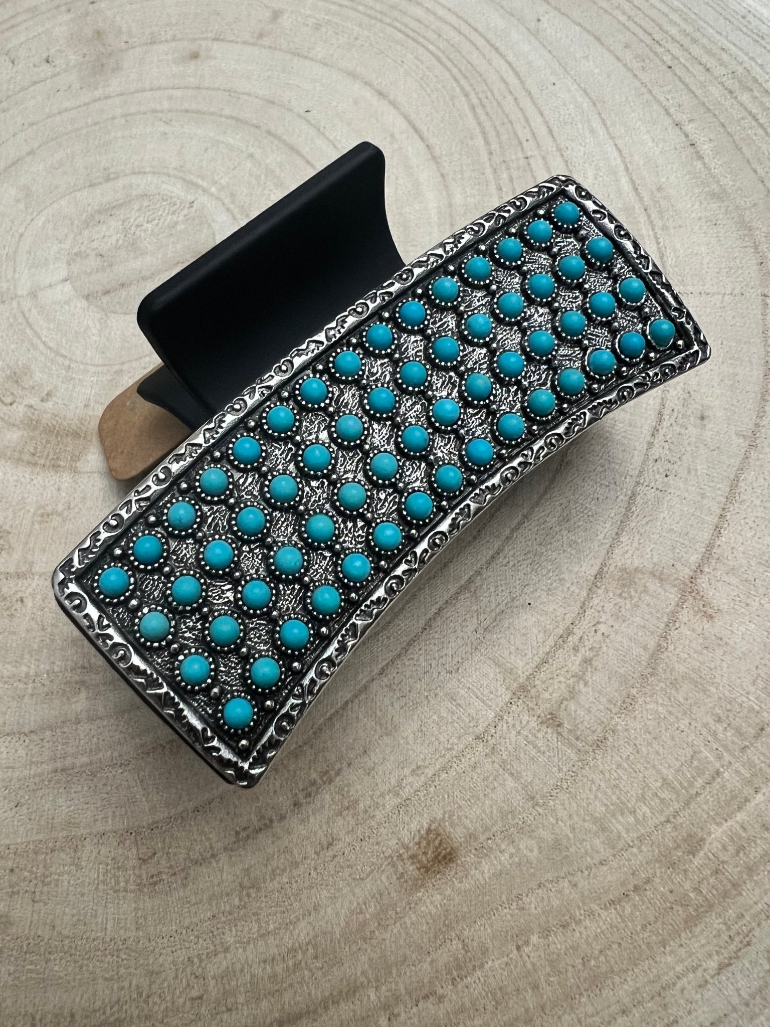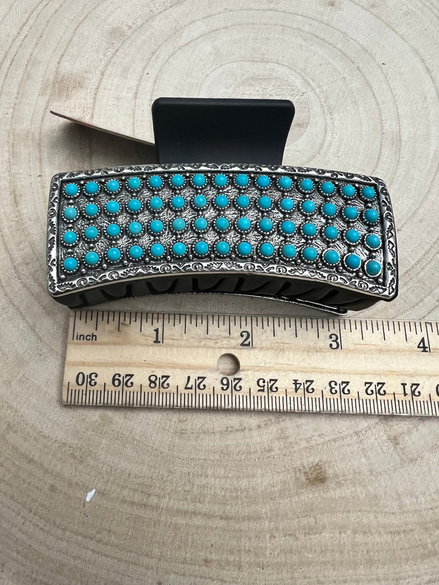 Saddle up your style with this striking 3 inch Western Faux Turquoise Cluster Hair Claw Clip. Crafted with authentic Western flair, this accessory features beautifully etched silver-tone metal work paired with eye-catching faux turquoise stone cluster that captures the spirit of the Old West.