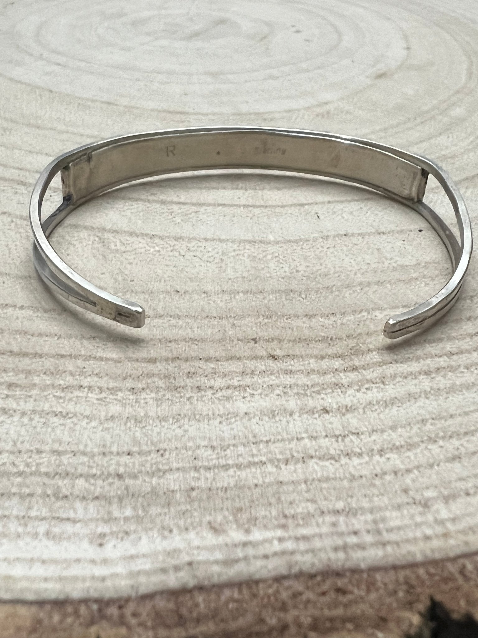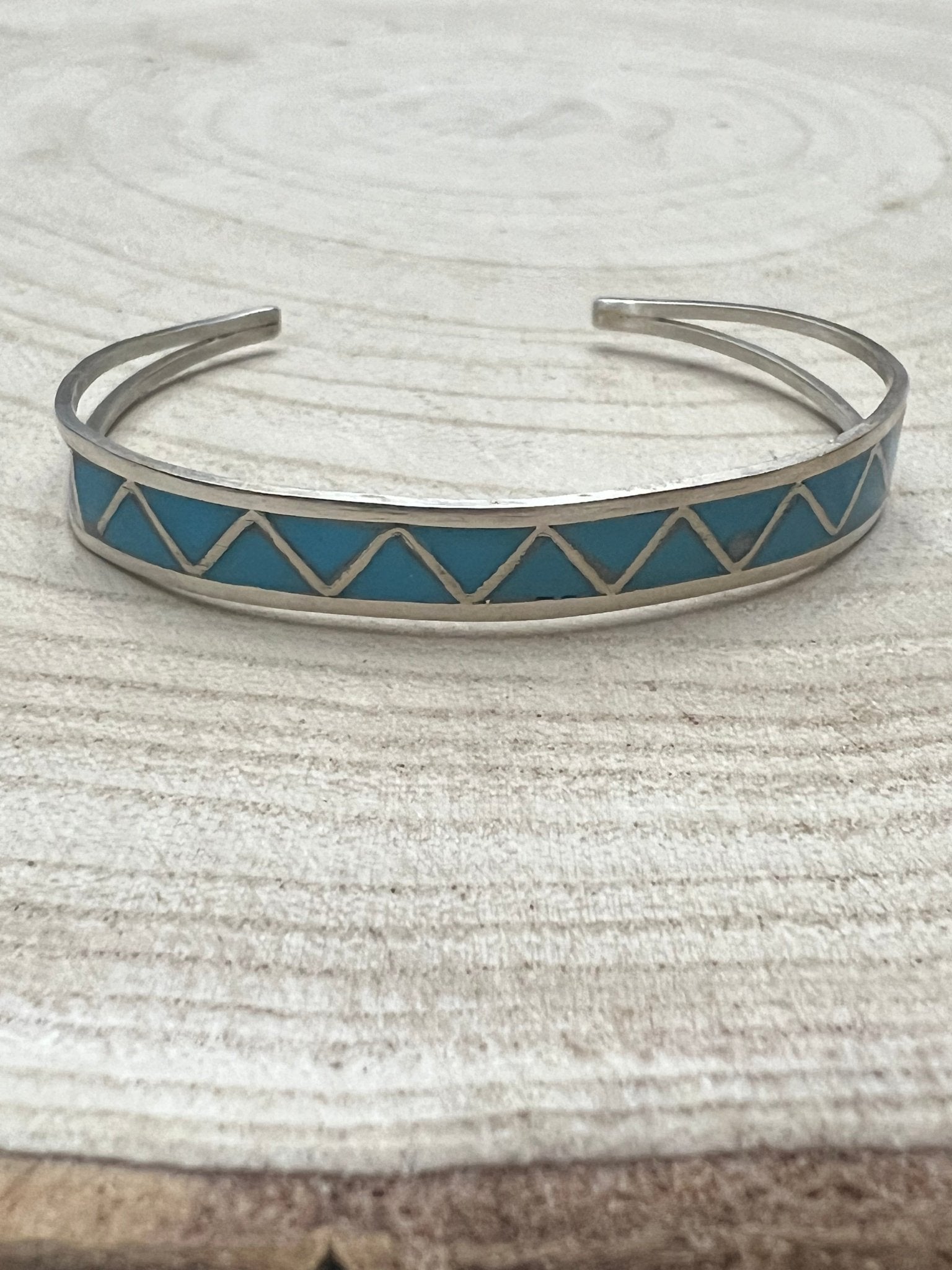 The Roger Morgan inlay Turquoise & Sterling Silver Bracelet is a finely crafted piece blending authentic Southwestern artistry with exceptional design. Made from sterling silver and genuine turquoise, this bracelet measures 5 3/8 inches in length with a -inch gap, making it an ideal fit for a 6 1/4-inch wrist.