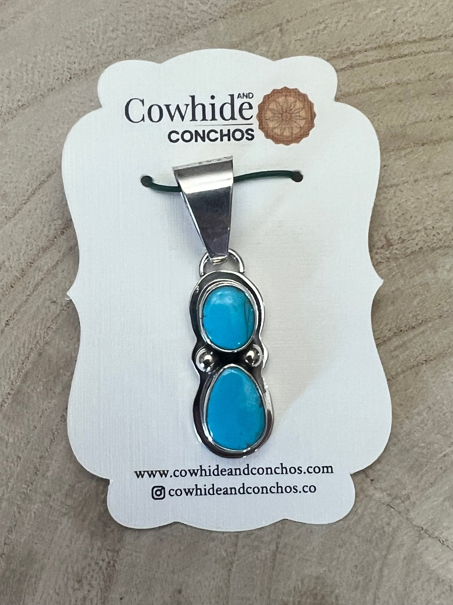 Crafted by renowned Navajo silversmith Kathleen Livingston, this pendant showcases a stunning Sonoran gem turquoise set in polished sterling silver. Measuring 1 1/4 inches long and 3/8 inches wide, it features intricate silverwork that highlights the vibrant blue-green stone's natural beauty.