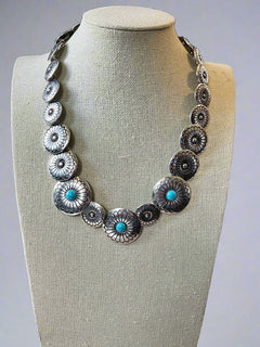 Elevate your Western style with this 18-inch Overlapping Concho Necklace featuring beautifully detailed conchos intertwined with vibrant faux turquoise stones. Crafted to evoke classic Southwestern charm, this necklace adds a bold statement to any outfit. The overlapping concho design and craftsmanship delivers a balanced, eye-catching look.