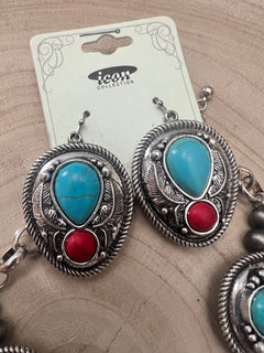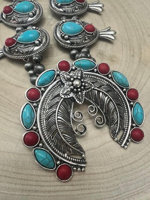 Capture the spirit of the West with this striking Faux Turquoise and Coral Statement Squash Blossom Set. Featuring bold, designs inspired by traditional Native American jewelry, this set combines vibrant faux turquoise and coral stones with intricate silver-tone detailing.