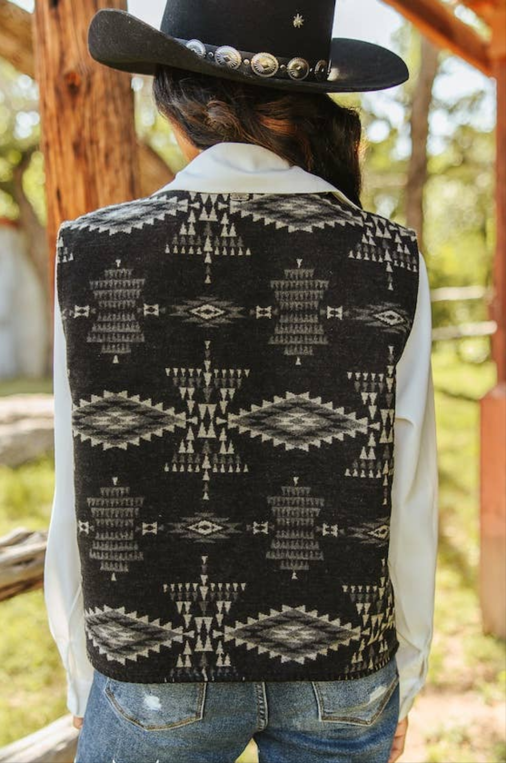 Step into timeless Western charm with this striking Aztec-printed button-down vest. Featuring a rich black base with intricate beige tribal-inspired motifs, this vest combines heritage style with contemporary flair. Designed with front button closures, a flattering tailored fit, and front pockets, it pairs perfectly with crisp collared shirts and denim.