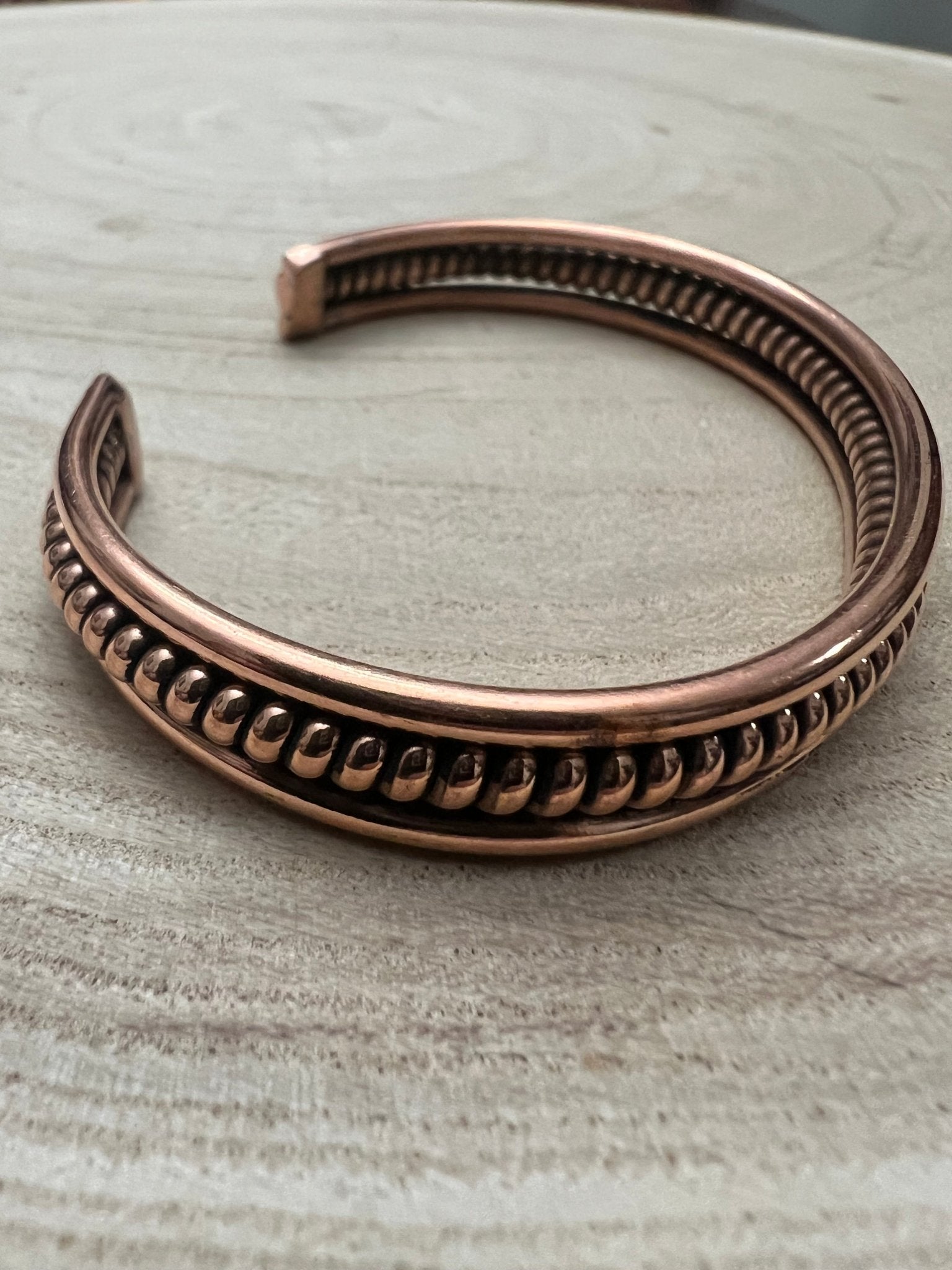 The Elaine Tahe Copper Bracelet is a finely handcrafted piece by Navajo silversmith Elaine Tahe, celebrated for her skill in crafting authentic Southwestern jewelry. Made from rich copper, this bracelet measures 6 inches long with a 1 1/8-inch gap, designed to fit comfortably on a 7 1/8-inch wrist.