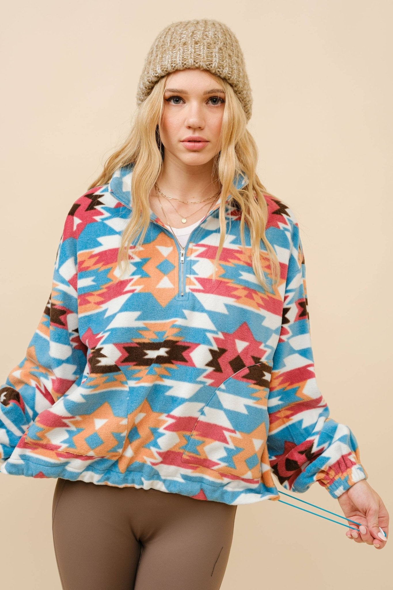 The Santa Fe Fleece Zip Up Pullover features soft printed fleece to keep you warm. This hooded pullover includes a comfy side pocket and a zip-up front with adjustable toggle cords for a perfect fit.