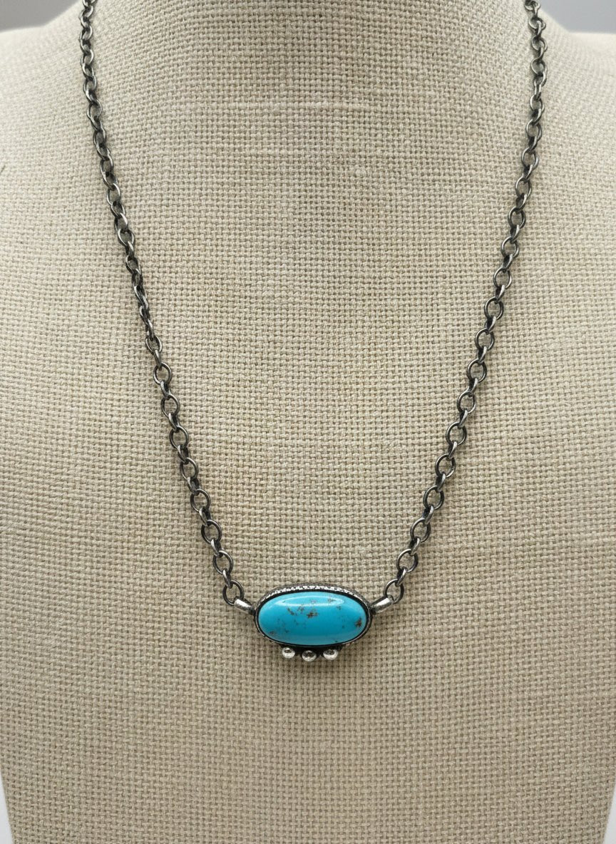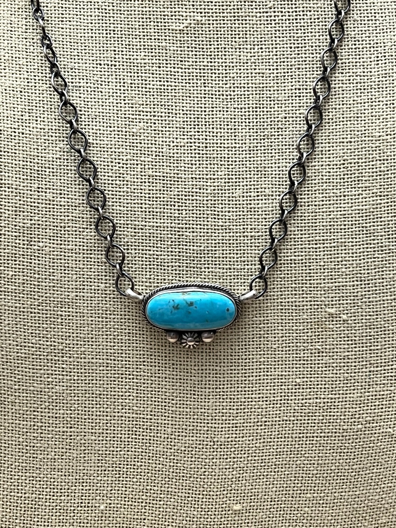 Crafted by renowned Navajo silversmith Kathleen Livingston, this necklace features genuine Sonoran Gem Turquoise set in high-quality sterling silver. Measuring 18 inches in length, it showcases a distinctive pendant that is 3/4 inch long and 1 inch wide, embodying authentic Western artistry. Each piece is hallmarked with Kathleen Livingston’s signature and sterling mark, ensuring its authenticity and craftsmanship.