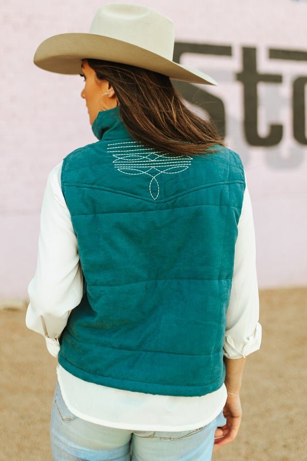 Step into bold Western comfort with our Boot Stitch Embroidered Rodeo Vest from Lucky & Blessed. Crafted for the modern cowgirl, this sleeveless vest features a rich fabric with quilted padding, delivering warmth without the bulk. A high collar adds edge and structure, while the front zip closure ensures a secure, flattering fit. The standout feature is the intricate white Western embroidery, stitched on both the chest pocket and across the back yoke - evoking classic rodeo flair with a modern twist. Spacious hand pockets provide functionality and laid-back charm.