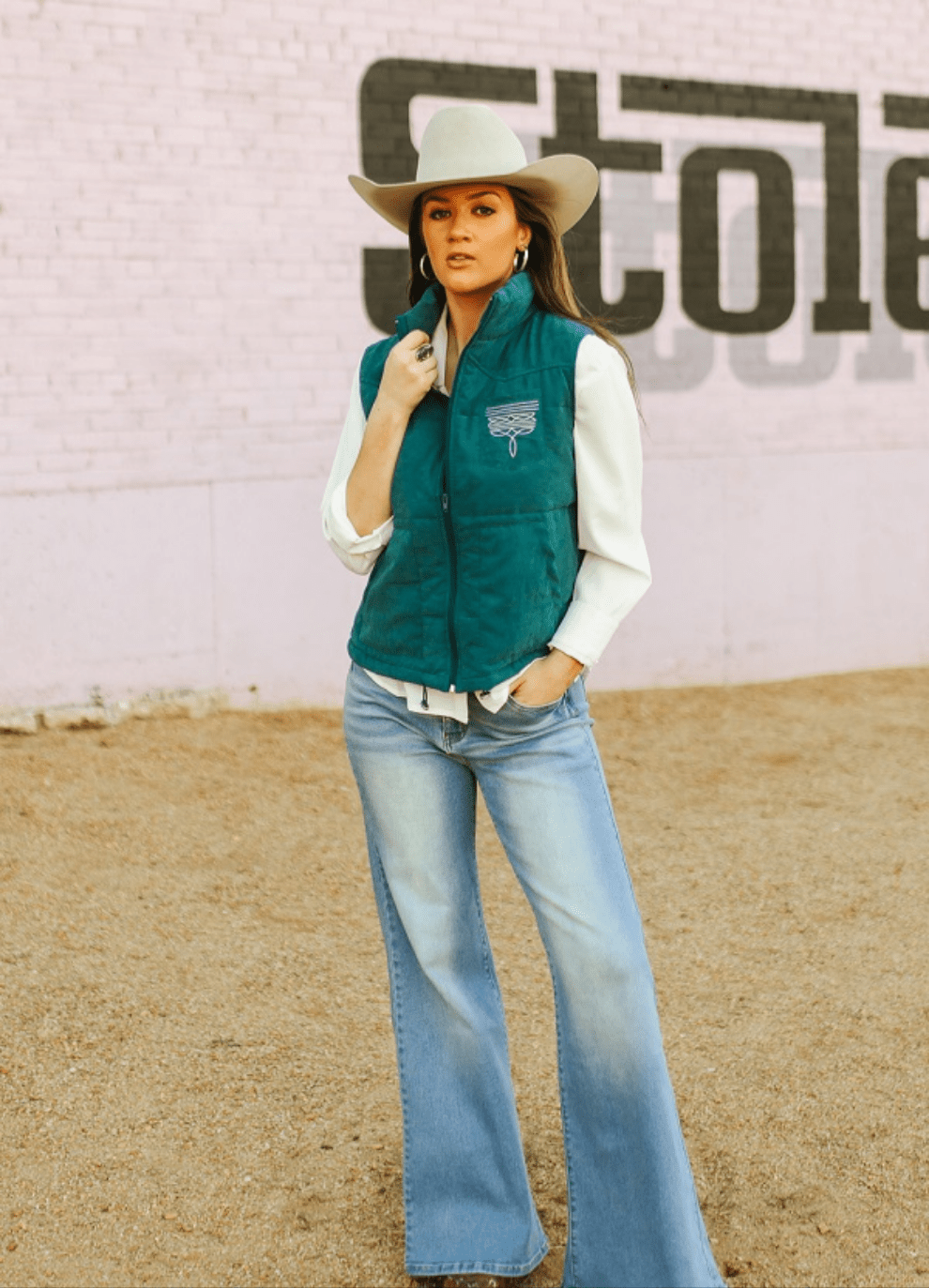 Women's western vest Embroidered rodeo vest wholesale Lucky & Blessed quilted vest Suede look padded vest Western boutique outerwear Sleeveless western layer for women Cowgirl rodeo outfit vest Southwestern fashion wholesale Fall winter western wear Wholesale country apparel for women NFR WESTERN RODEO WESTERN APPAREL
