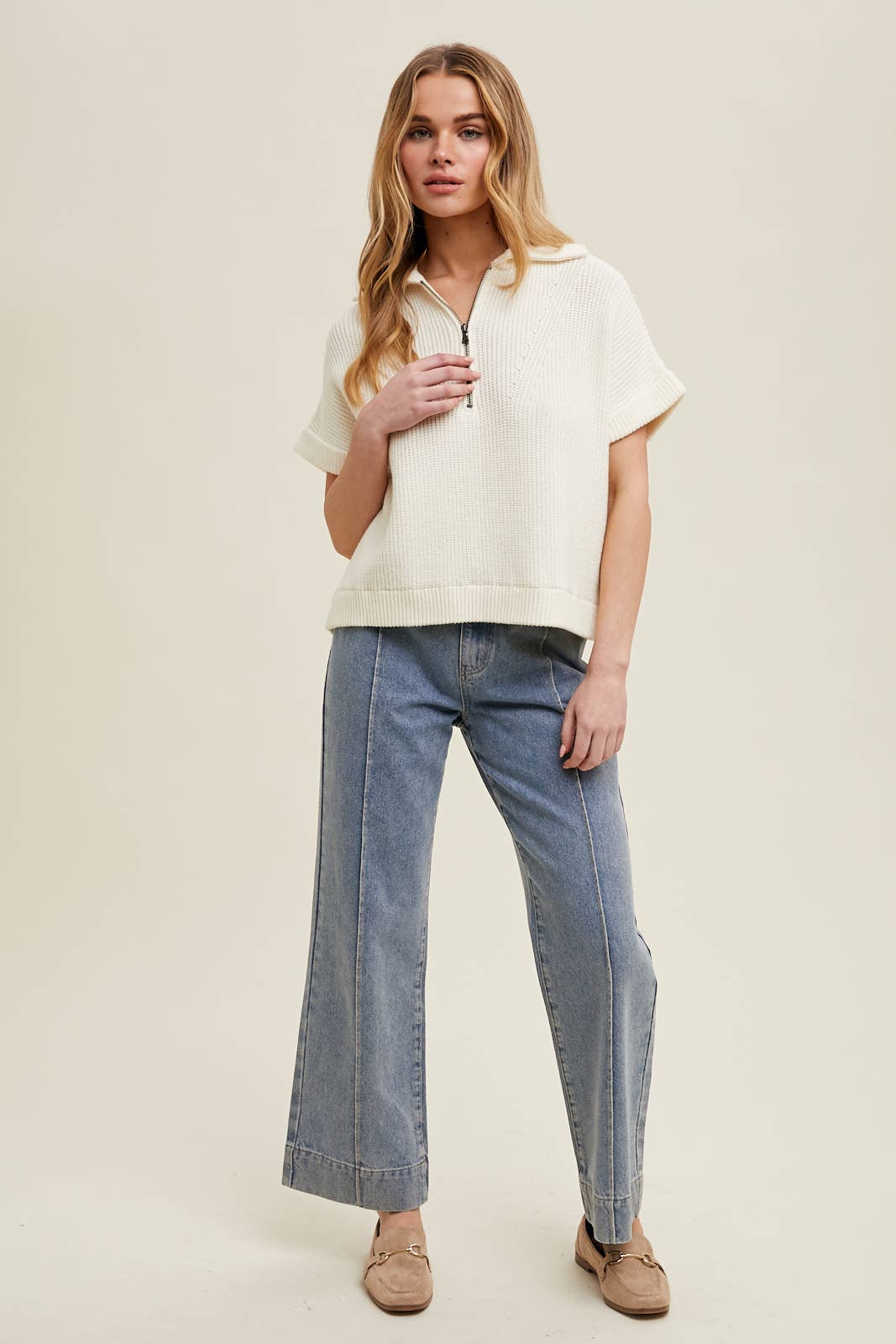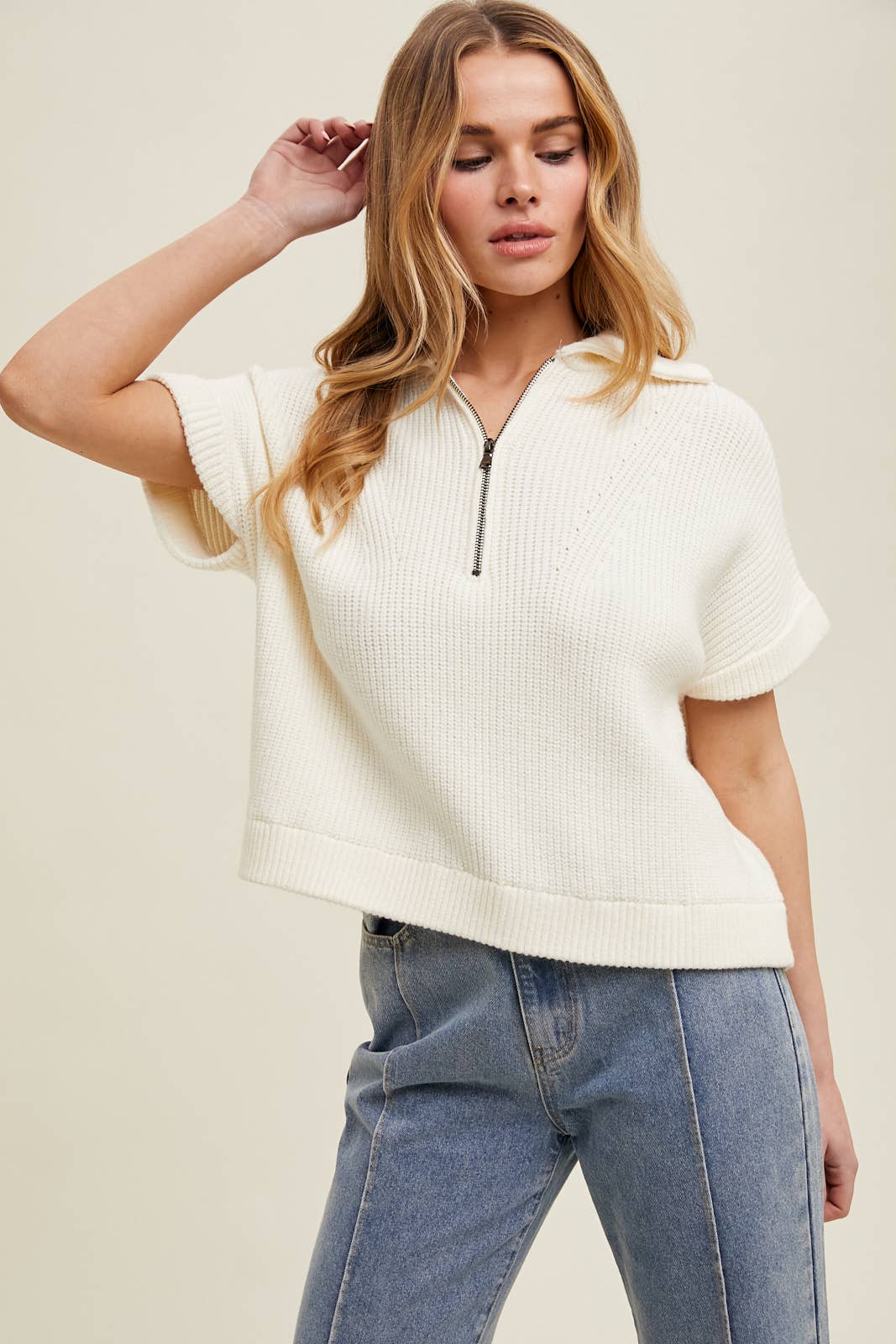This half-zip pullover sweater features short sleeves and a classic collar, offering a relaxed and comfortable fit perfect for casual days and everyday wear.