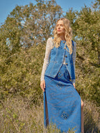 Medium-wash sleeveless denim vest with gold shank buttons and side welt pockets. Perfect for casual and polished looks.