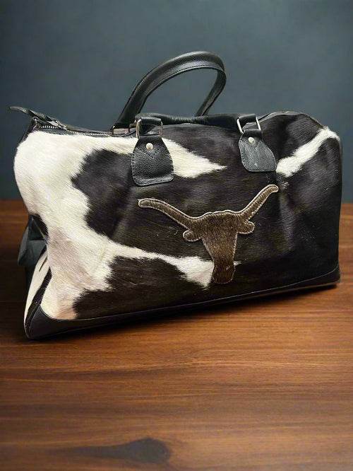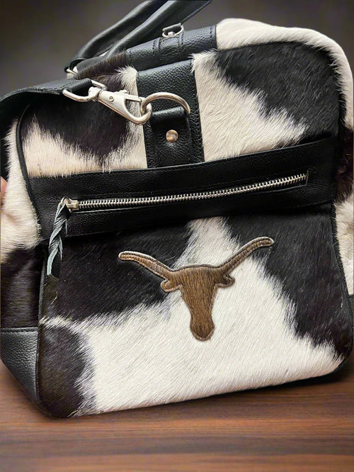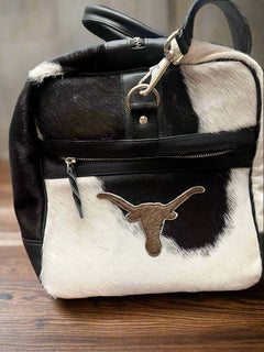 Experience the rugged charm of the Black and White Longhorn Cowhide Duffle Bag, a true testament to Western craftsmanship. Each bag is a unique work of art, crafted from full hair-on-hide cowhide that wraps around every inch, ensuring durability and distinctive style. Designed with practicality in mind, it features a matching cowhide shoulder strap for comfortable carrying and meets carry-on flight requirements, making it perfect for your travels. Thoughtful details include longhorn appliques on both end of the bag, zipper storage compartments on both ends and an inside pocket to keep your essentials organized. This duffle bag blends authentic Western flair with everyday functionality.