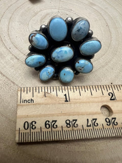 Experience authentic Navajo craftsmanship with the Dave Skeets Golden Hills Cluster Wide Band Ring, size 8. This striking piece features a bold cluster design inspired by the rugged beauty of the Western landscape.