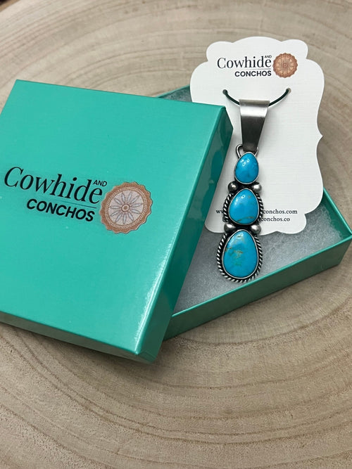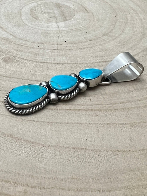 Crafted by renowned Navajo silversmith Paul Livingston, this pendant showcases a stunning Sonoran gem turquoise set in high-quality sterling silver. Measuring 2 3/4 inches long and 5/8 inch wide, it features intricate craftsmanship and bears the hallmark of authenticity: Paul Livingston, Sterling.