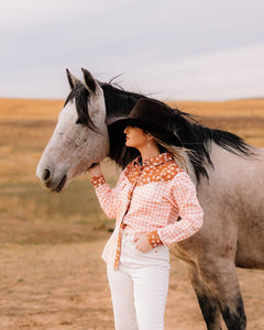 Featuring authentic pearl snap buttons, it provides easy closure and a touch of cowgirl charm. The long sleeves make it versatile for layering in cooler weather or wearing alone on mild days. Perfect for rodeos, ranch work, or casual outings, this shirt combines timeless Western appeal with a playful ditzy daisy print for a unique, stylish look.