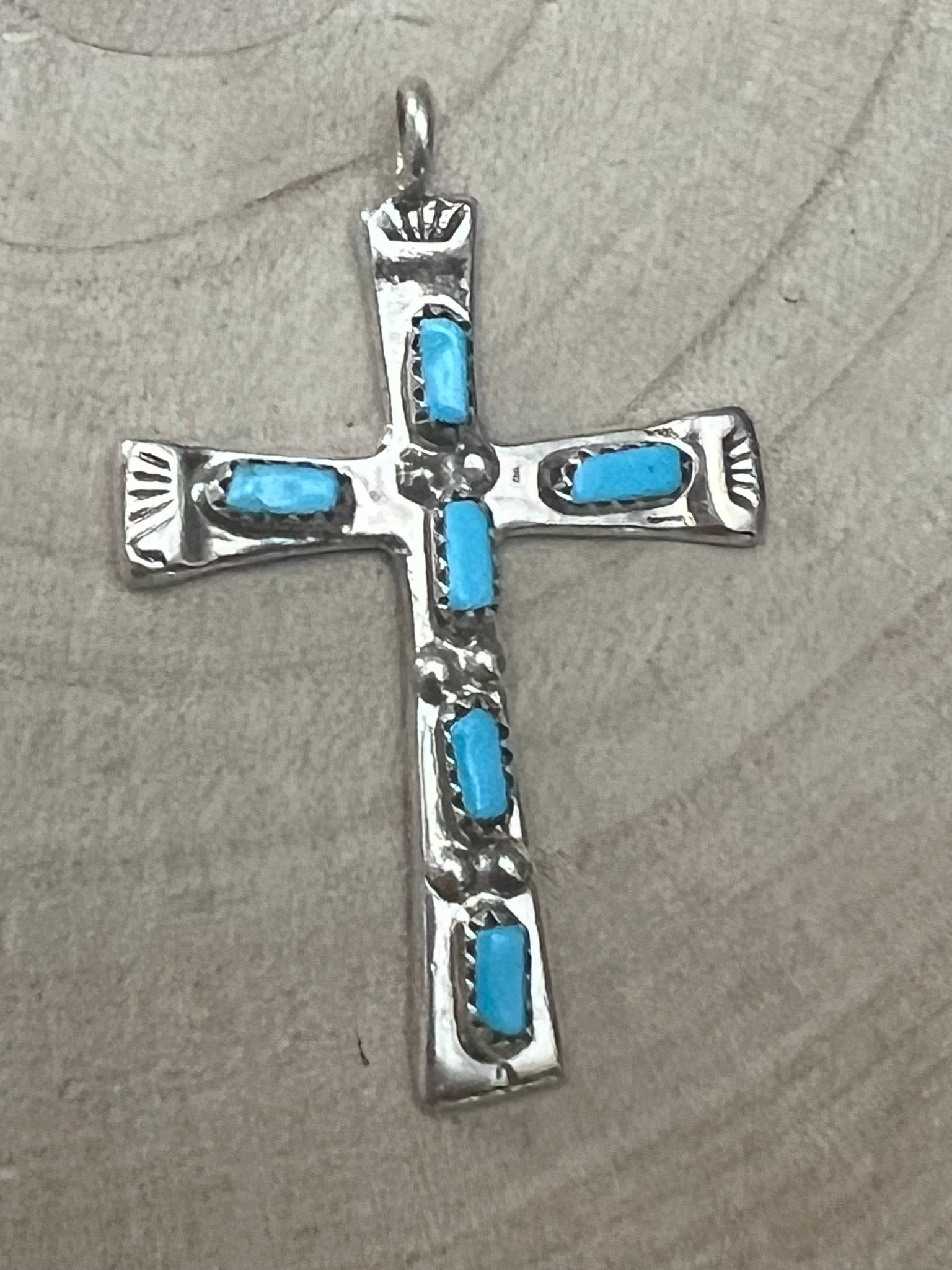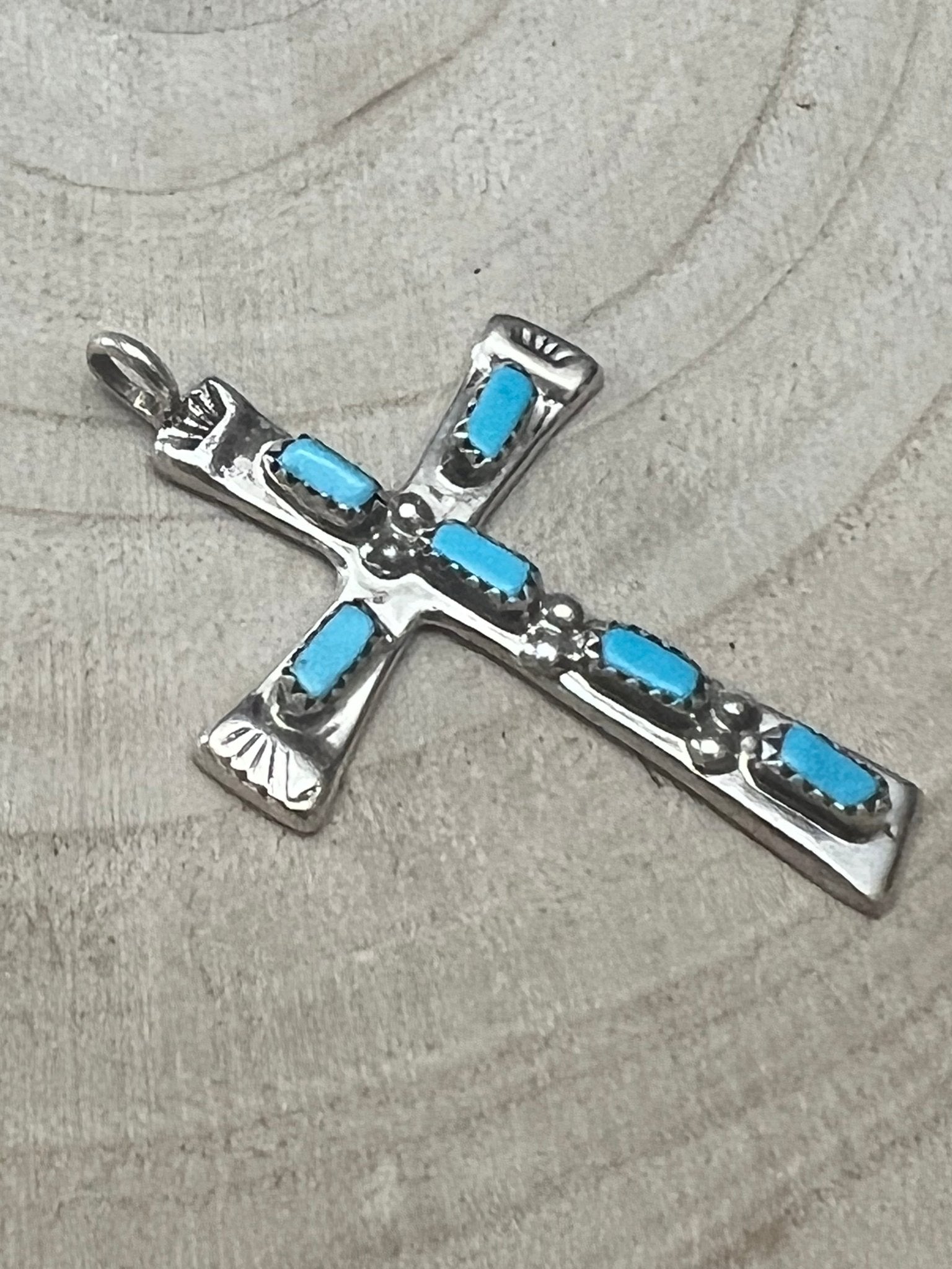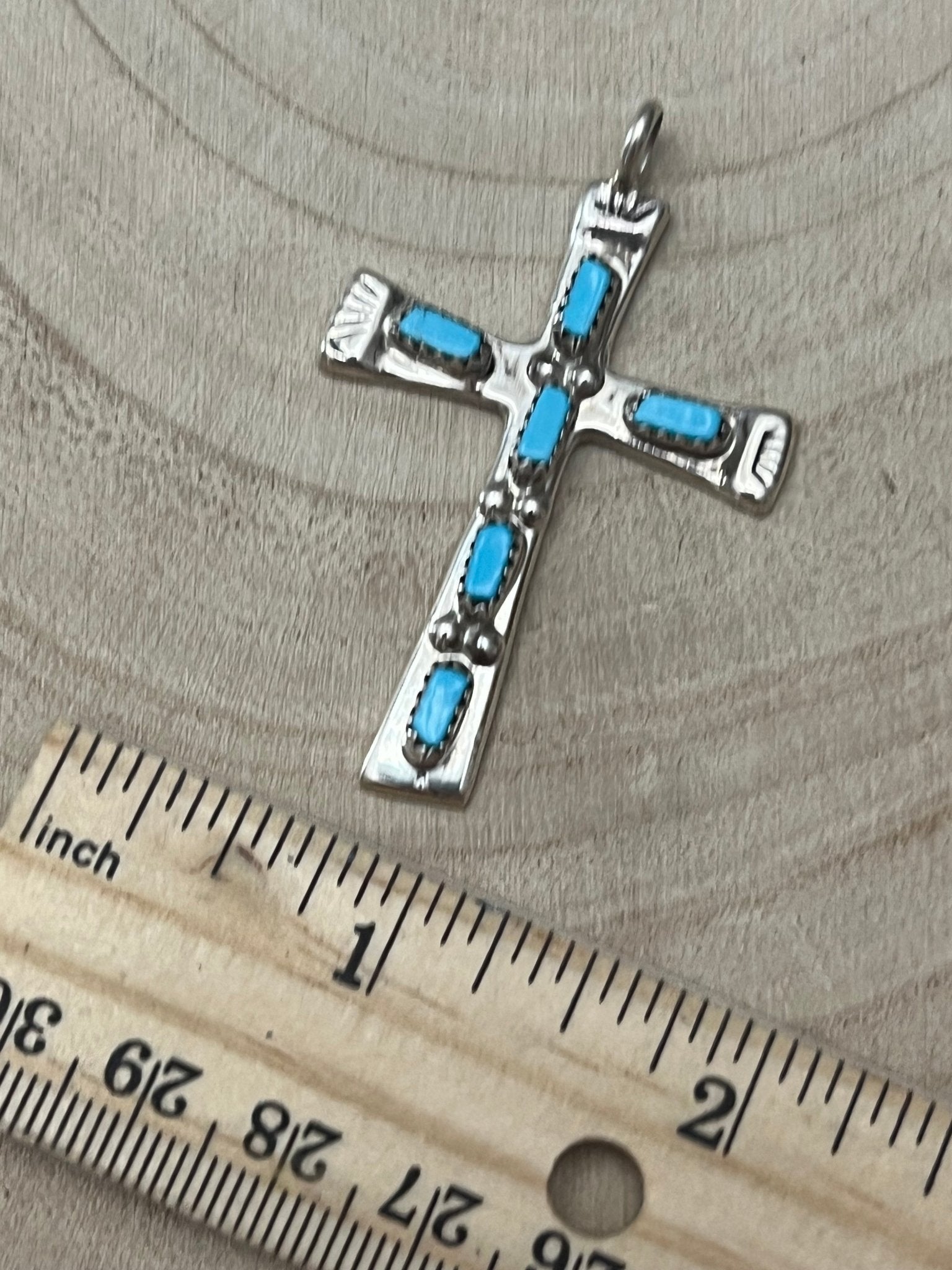 The C. Iule Zuni Handmade Turquoise Cross Pendant showcases exquisite craftsmanship rooted in Zuni tradition. Featuring vibrant turquoise stones set in a finely detailed silver cross, this pendant embodies both spiritual symbolism and authentic Southwestern artistry.