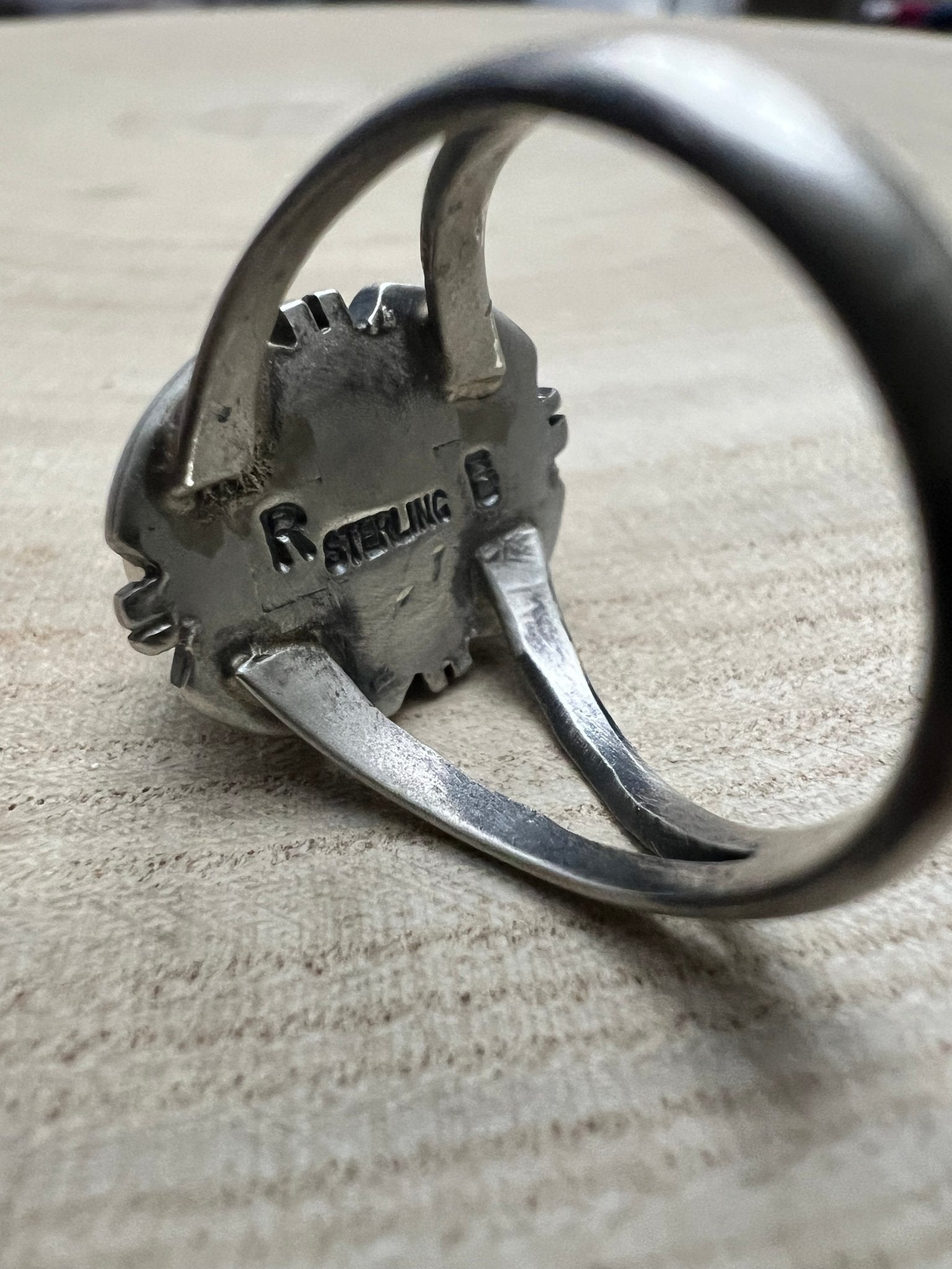 The warm golden hues of the natural Golden Hills turquoise are beautifully complemented by the polished silver, reflecting skilled craftsmanship and traditional Native American artistry. Marked with the RB hallmark and sterling stamp, this ring delivers authentic quality and timeless Western style for enthusiasts of genuine handcrafted jewelry.